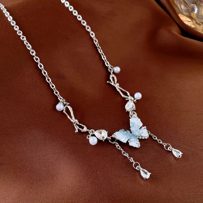 The design embodies a charming cottagecore or fairycore aesthetic, perfect for those who love whimsical and nature-inspired jewelry. The silver-tone metal and mixed elements create a beautiful, layered look. The butterfly is flanked by draped chain accents ending in small crystal drops, adding elegant movement.