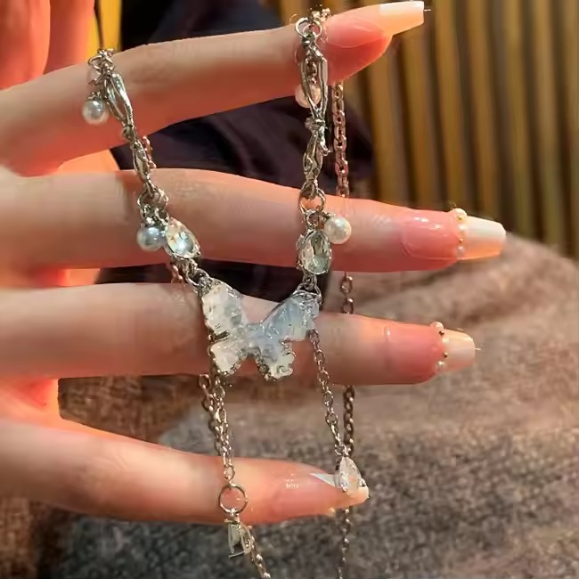 This enchanting piece features a delicate, sculpted butterfly pendant with a subtle, shimmering opalescent or frosted crystal texture, giving it a light, ethereal quality. The pendant is centrally placed on a unique linked chain adorned with pearl accents and small, faceted clear crystals that reflect the light.