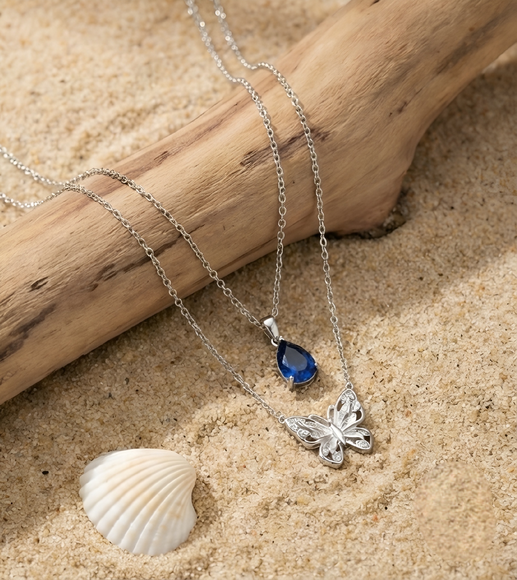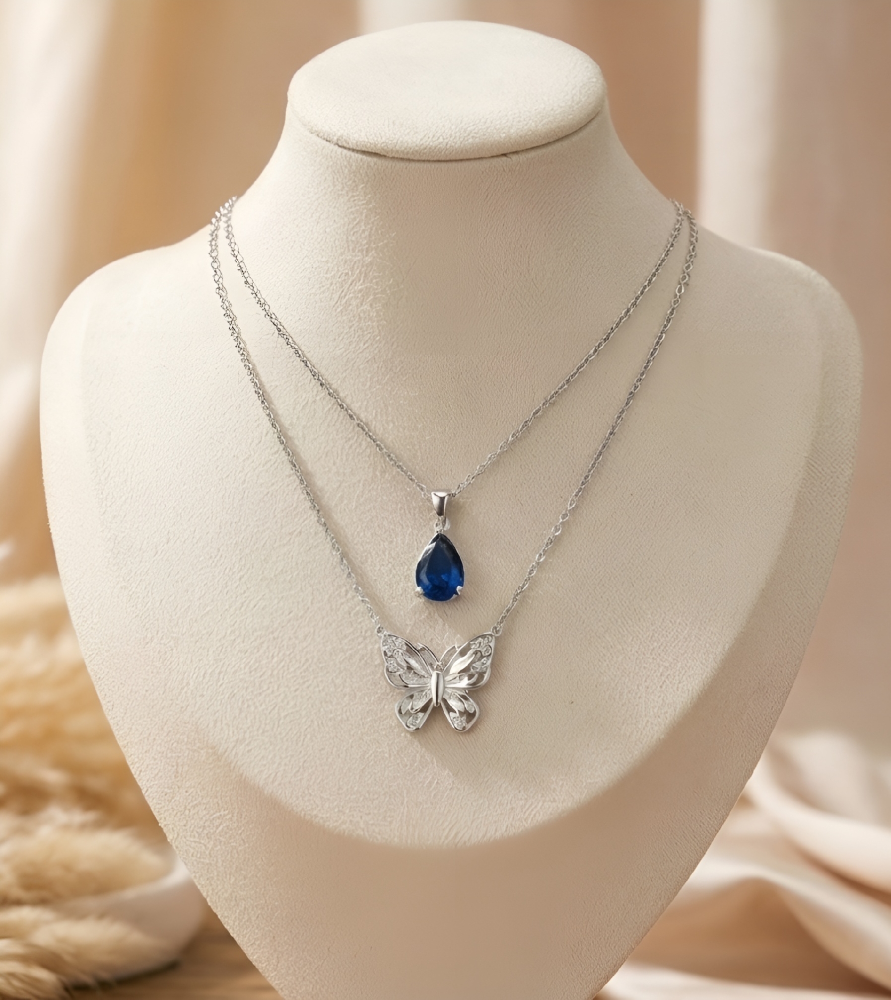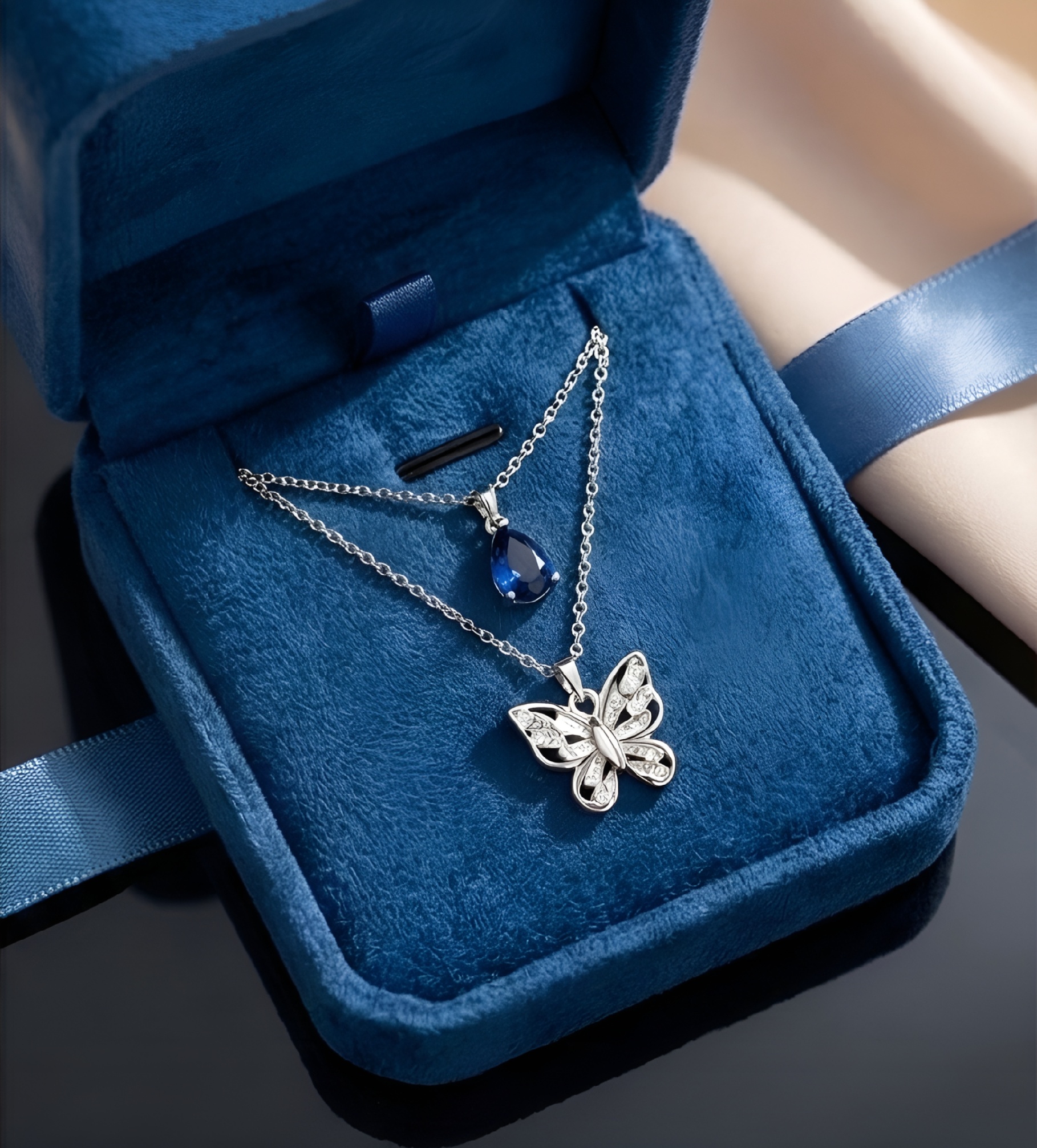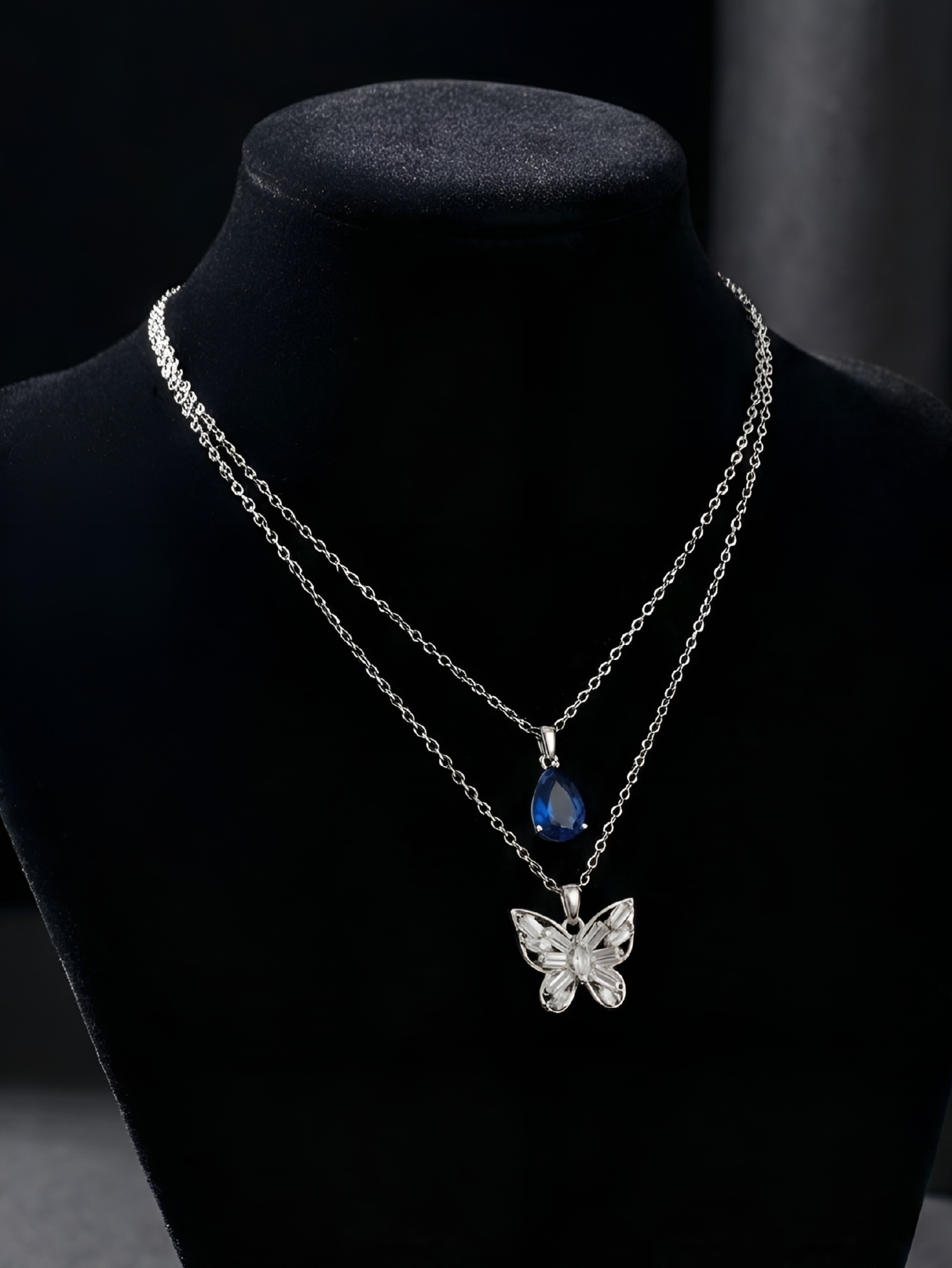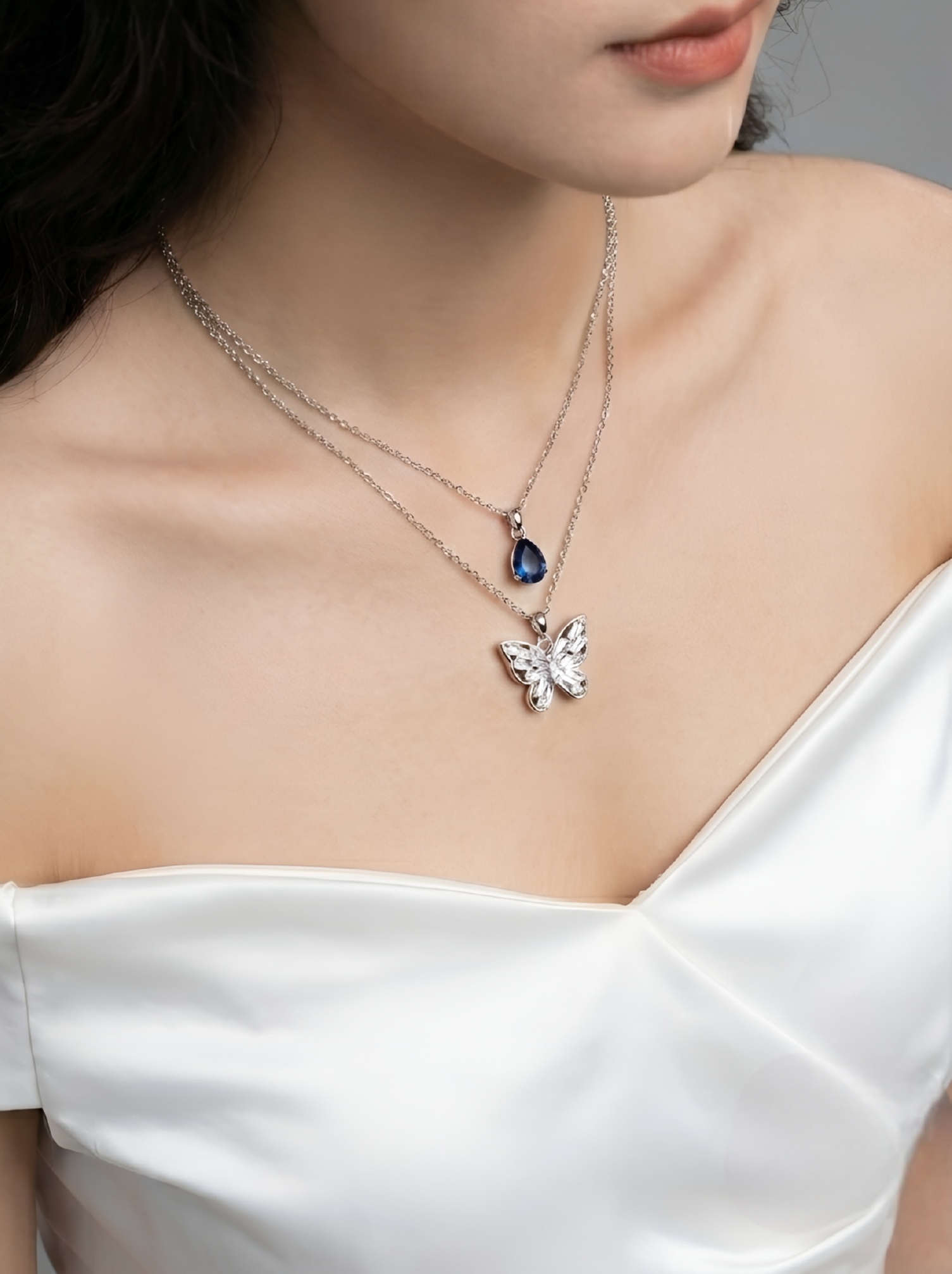 Bottom Layer: A detailed butterfly pendant fully encrusted with dazzling micro-pavé cubic zirconia stones. The wings shimmer with every movement, providing brilliant contrast.